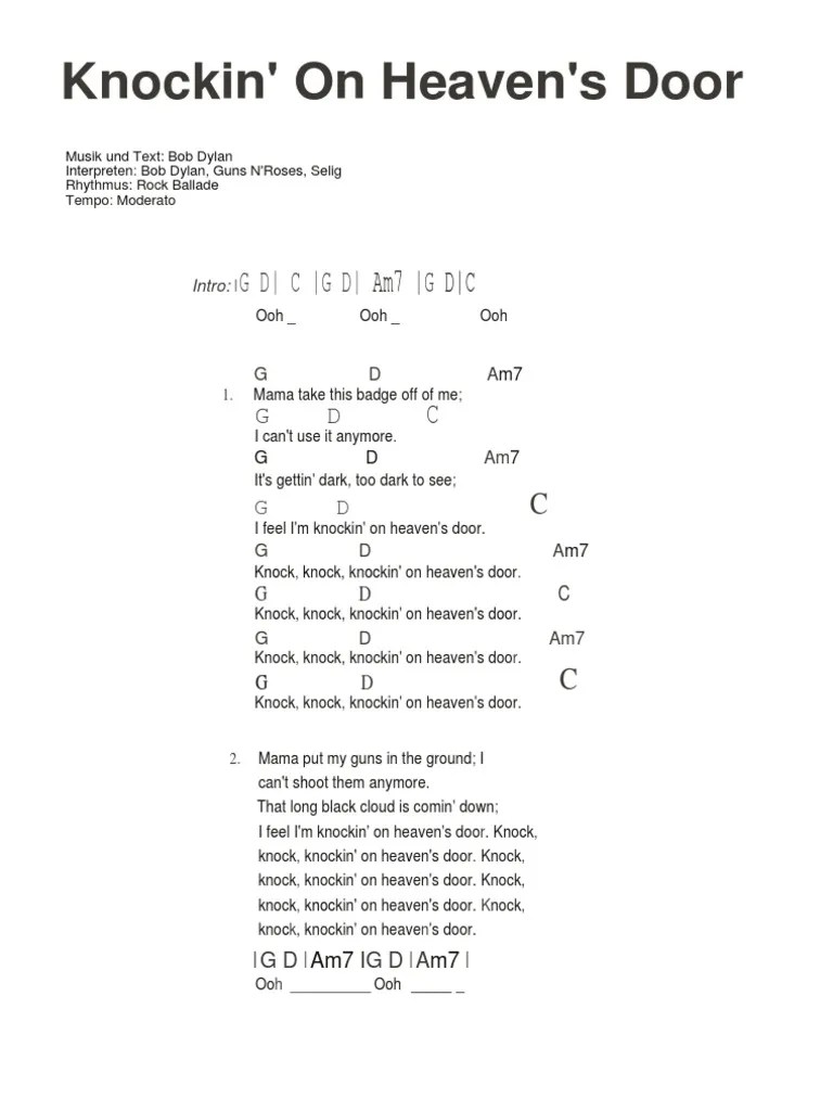 I can’t shoot them anymore. Mama, put my guns in the ground.Mama, leg meine gewehre auf den boden. Bob Dylan Knocking on Heavens Door (Backing track with guitar chords I feel i’m knockin’ on heaven’s door knock, knock, knockin’ on heaven’s door knock, knock, knockin’ on heaven’s door knock, knock, knockin’ on heaven’s door knock, knock, knockin’ on. Knock, knock, knockin' on heaven's door knock, knock, knockin'. Knock, knock, knockin' on heaven's door knock, knock, knockin' on heaven's door knock, knock, knockin' on heaven's door knock, knock, knockin' on heaven's door mama i can hear that. It's gettin' dark, too dark to see i feel like i'm knockin' on heaven's door. Knock, knock, knockin’ on heaven’s door. Knock, knock, knocking on heaven’s door. It's getting dark, too dark to see.. Mama, take this badge off of me i can't use it anymore.